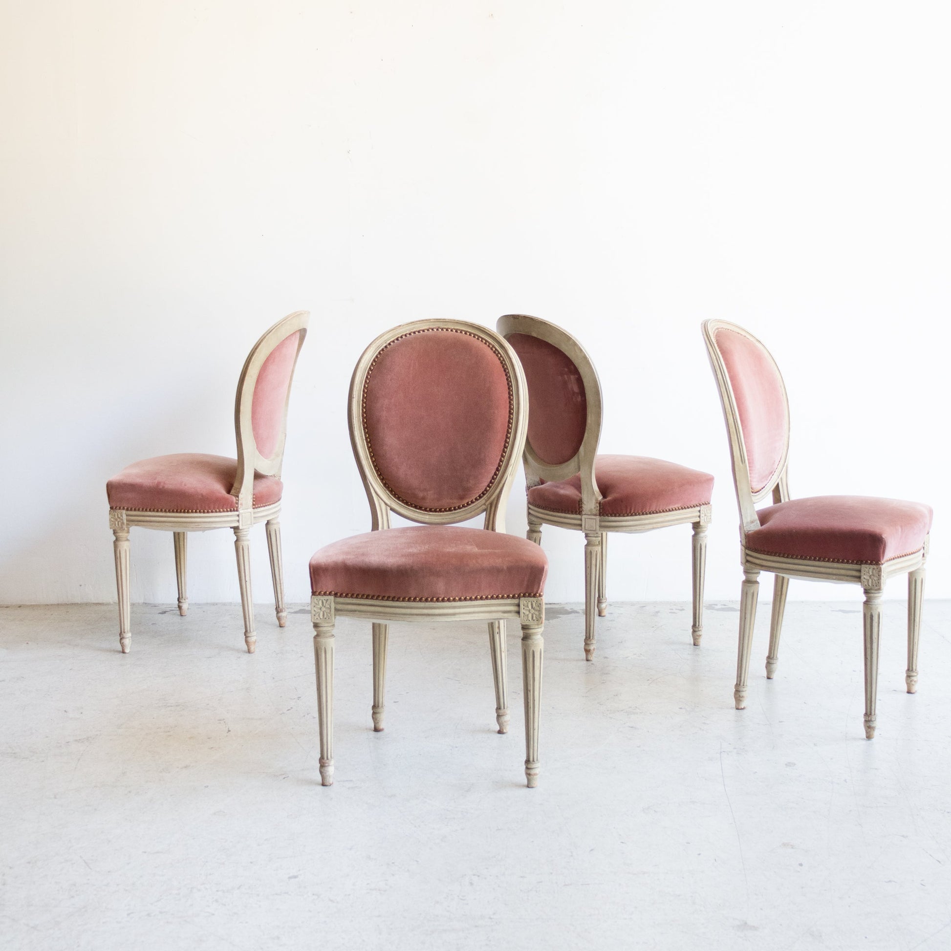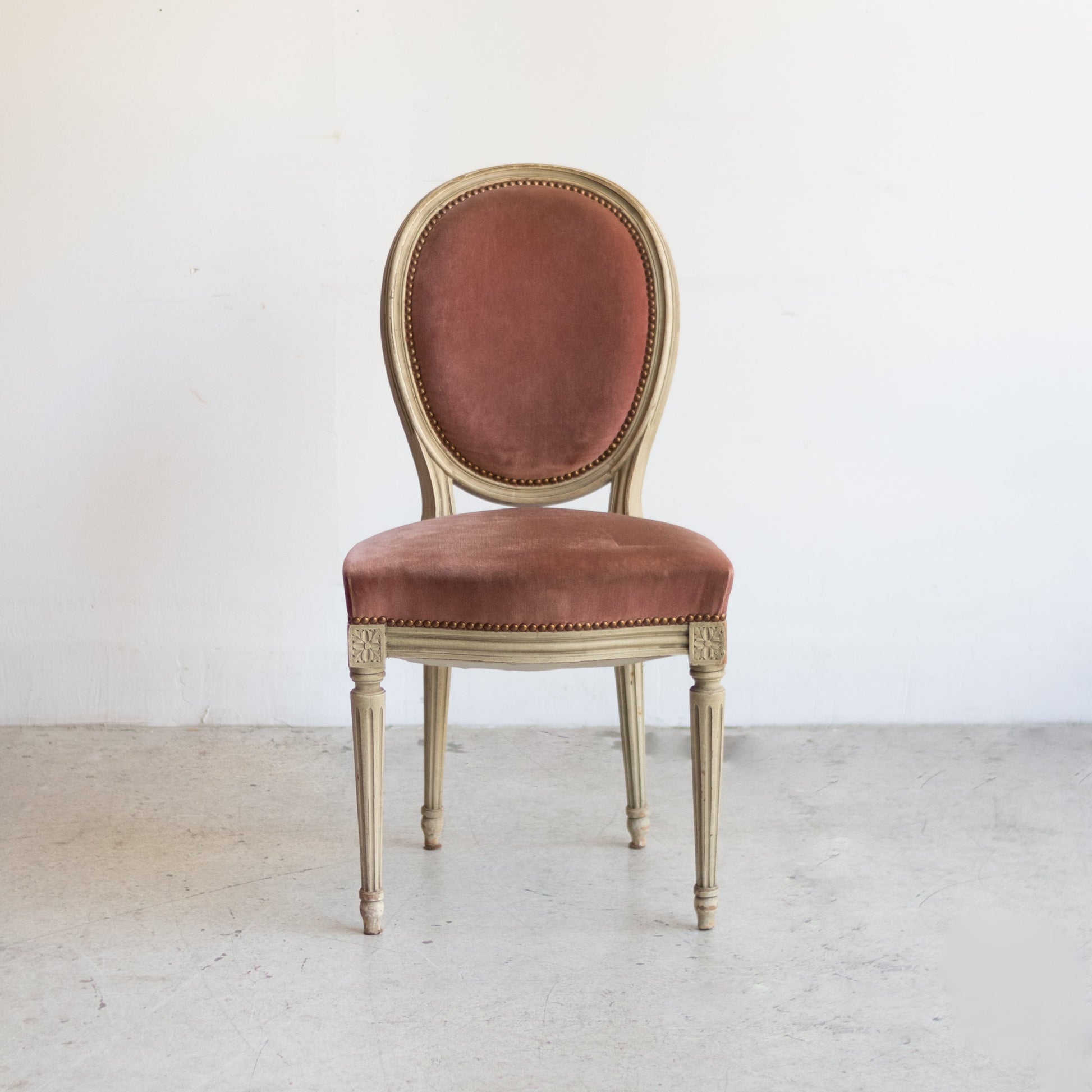 - Original dusty pink velvet and brass nailheads.