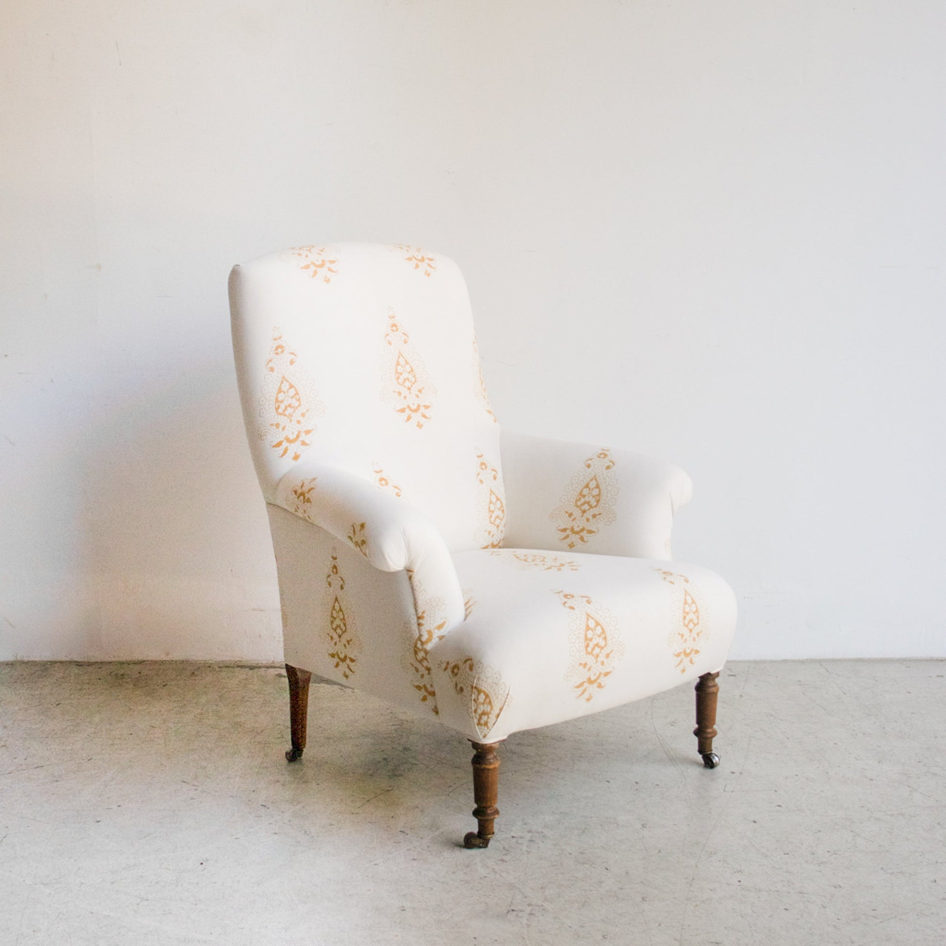 This vintage French armchair has been carefully restored and re-covered in an organic cotton, Indian block print that gives new life to a well-loved classic.